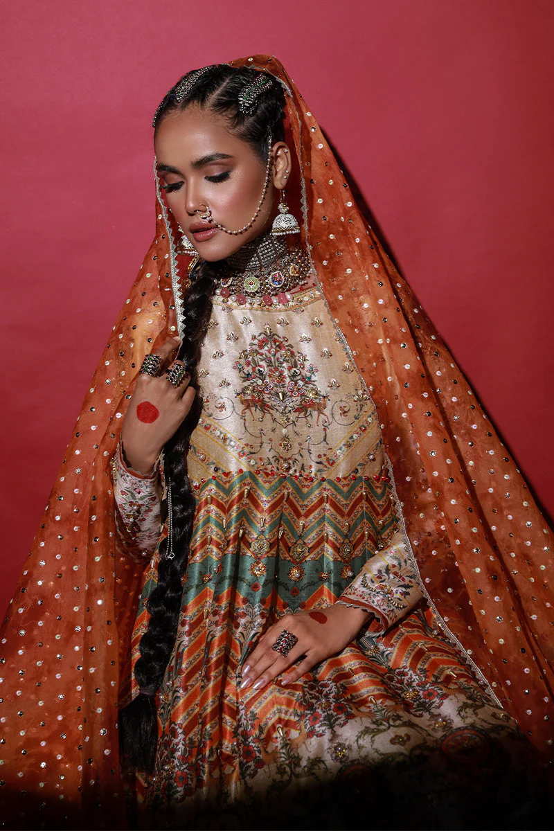 This beautiful Digital Printed Long Pishwas in stunning combination of Burnt Orange and Ivory features Mughal ShikarGah inspired custom print featuring Geometric Patterns mixed with Deer, Poppy Flower and Peacock Motifs. Adorned with formal hand embroidery of heavy pearls, Swarovski crystals, sequin work, bead-work ad heavy button detailing. Paired with Burnt Orange Korean Silk Dhaka Pajama.