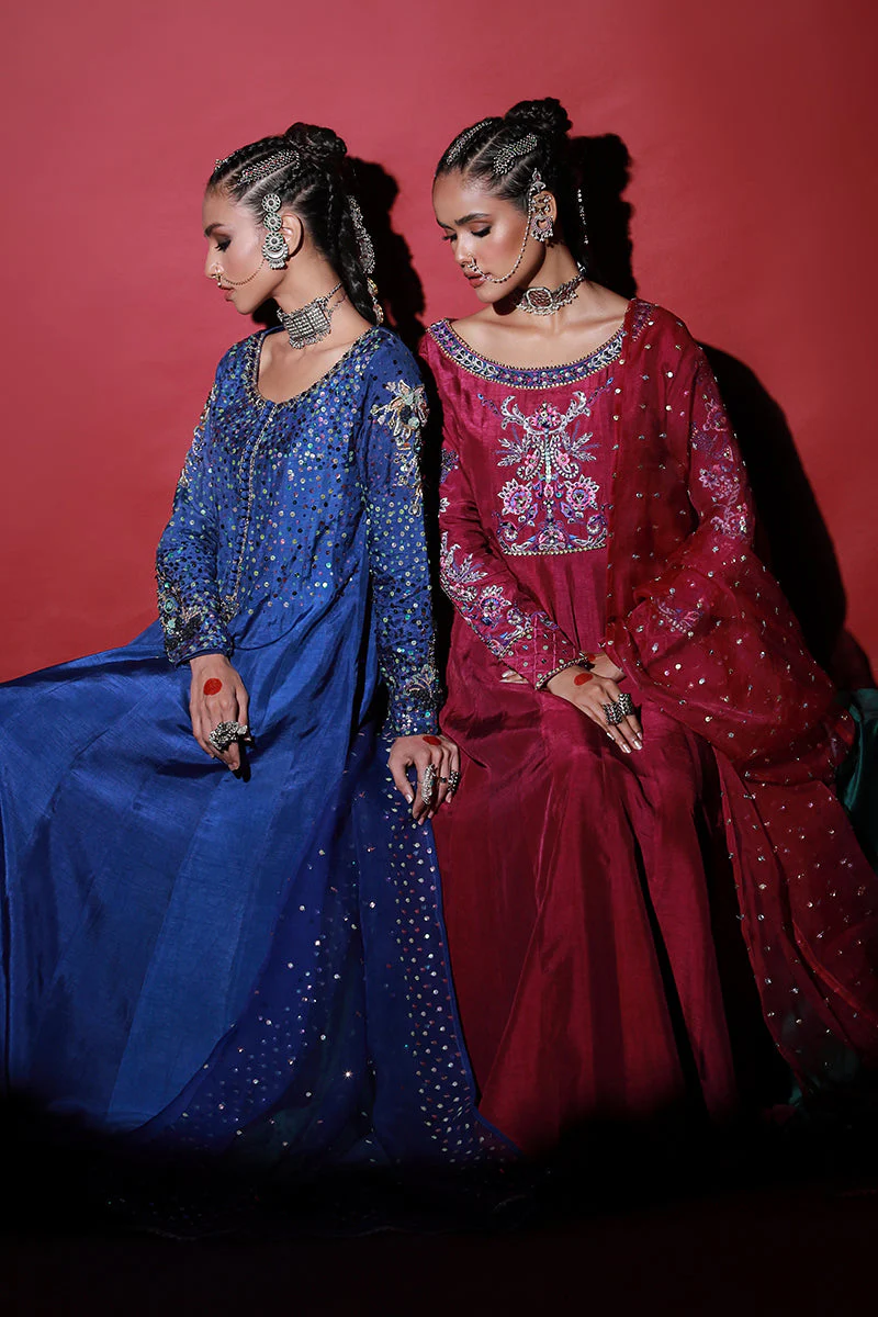 This beautiful Deep Magenta Long Pishwas is adorned with formal hand embroidery of Resham Work, Zardose, Sequin, Swarovski Crystals and Bead Work featuring floral motifs ad Cutwork Back Detail. Paired with matching Dhaka Pajama.