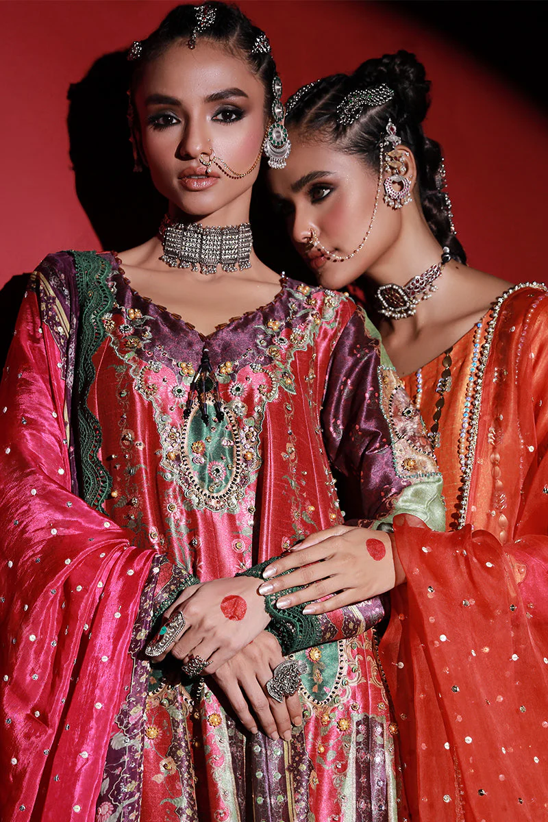 This beautiful Digital Printed Long Pishwas in stunning combination of Deep Orange and Hot Pink features Mughal Garden inspired custom print featuring Poppy Flowers and Mehraab motifs. Adorned with formal hand embroidery of heavy pearls, Swarovski crystals, sequin work, bead-work and intricate buttons detailing. Paired with Deep Purple Korean Silk Dhaka Pajama.