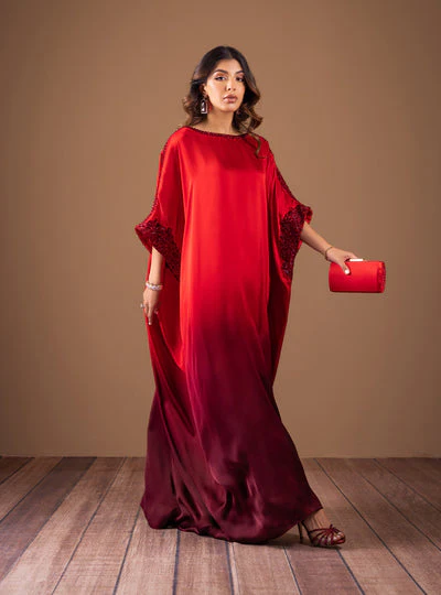 Capture this captivating look in the shades of red and black hues, this shamose silk kaftan gives a rich look with hand worked beads complimenting the attire and giving it a piece of art look.