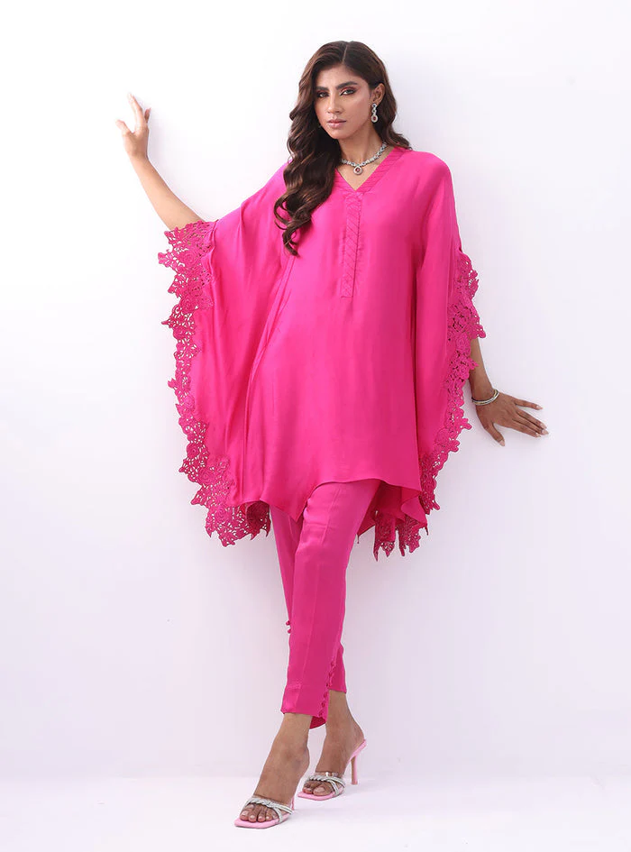 The stunning cape is allured with embroidered drape, enhancing the look. Paired with matching pants finishes the look